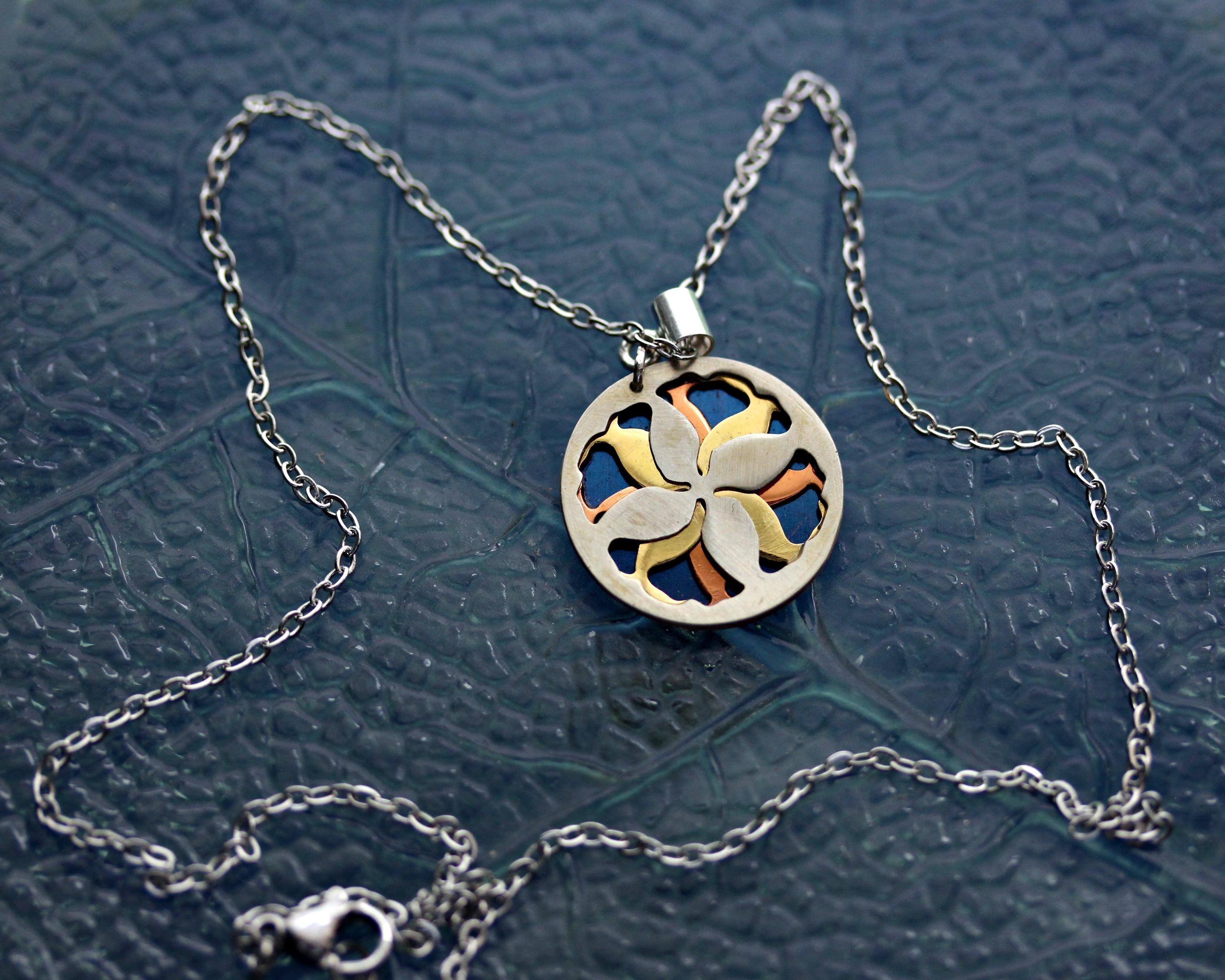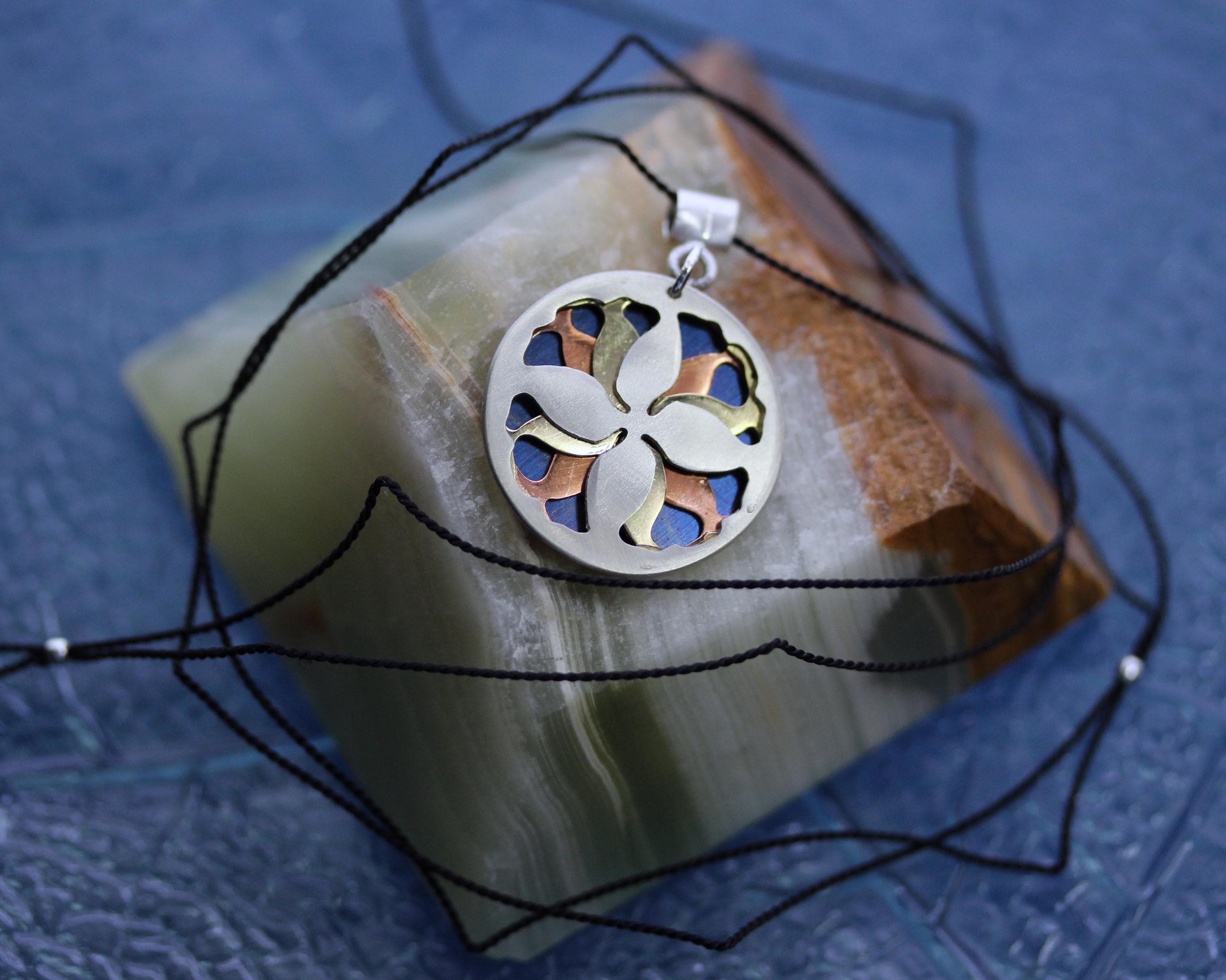 Mandala utkana z ornamentu wykonanego z czterech metali: srebrnej alpaki, ciepłej miedzi oraz złotego i błękitnego mosiądzu.