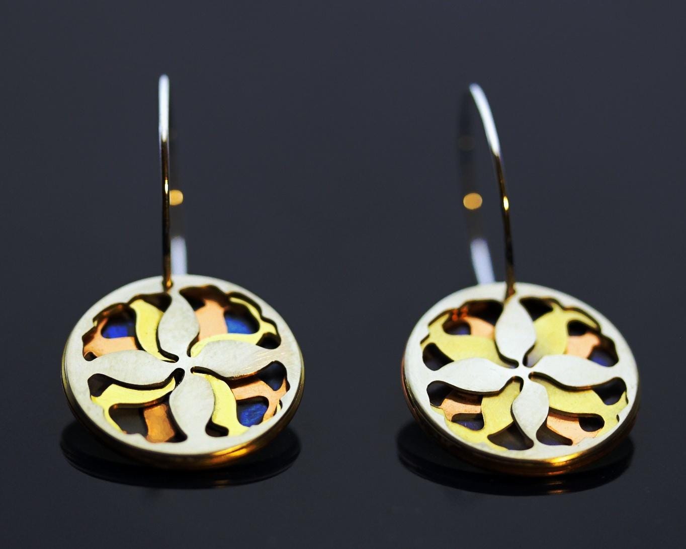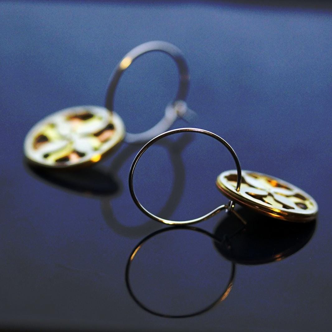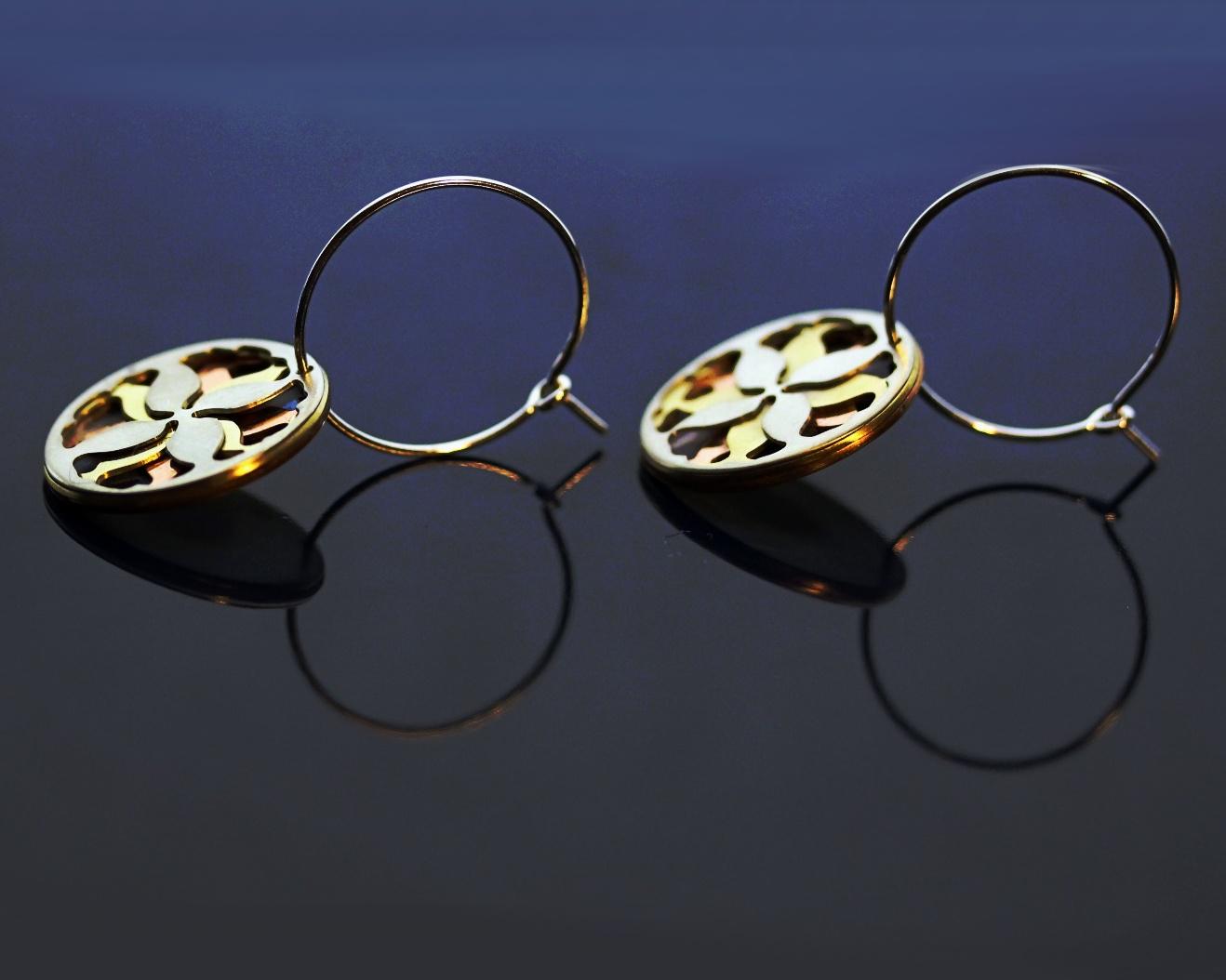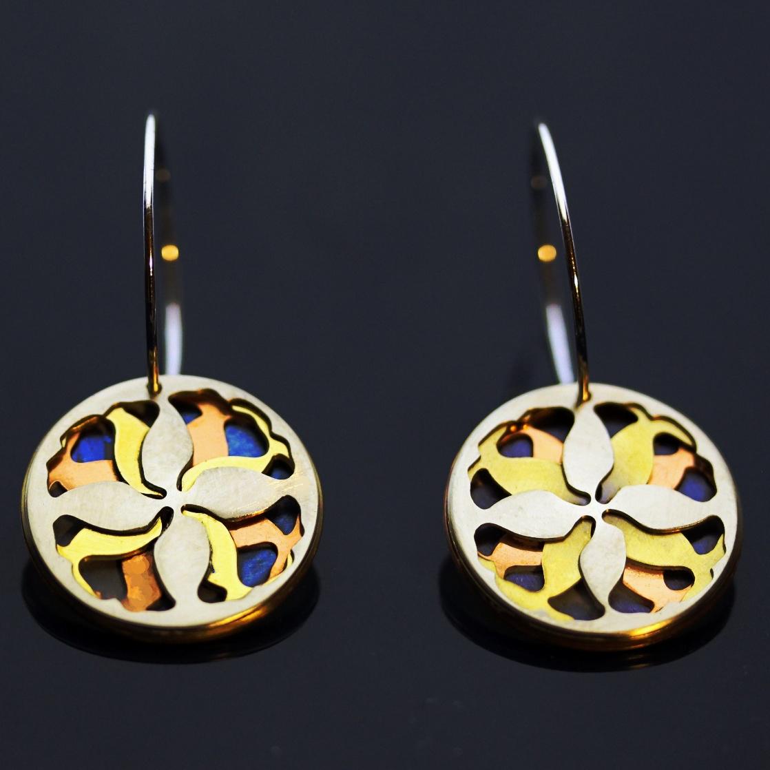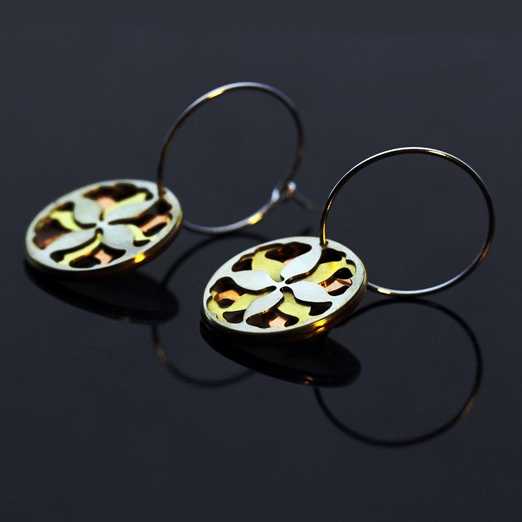 Leaves mandala earrings No.2. These beautiful round hoop earrings are decorated with a lovely abstract floral ornament. They have delicate cut-outs and are lightweight, so they vibrate with colours of blue, yellow, orange and silver in muted metallic tones, creating an elegant yet bold piece. The sheen of the metal reflects subtle light, highlighting its artistic details and adding sophistication to the overall look. The whole piece exudes craftsmanship, inviting a closer look at the unique combination of materials and design elements, embodying both modern style and artistic flair. Made of made blue brass, copper, yellow brass and silver alpaca.