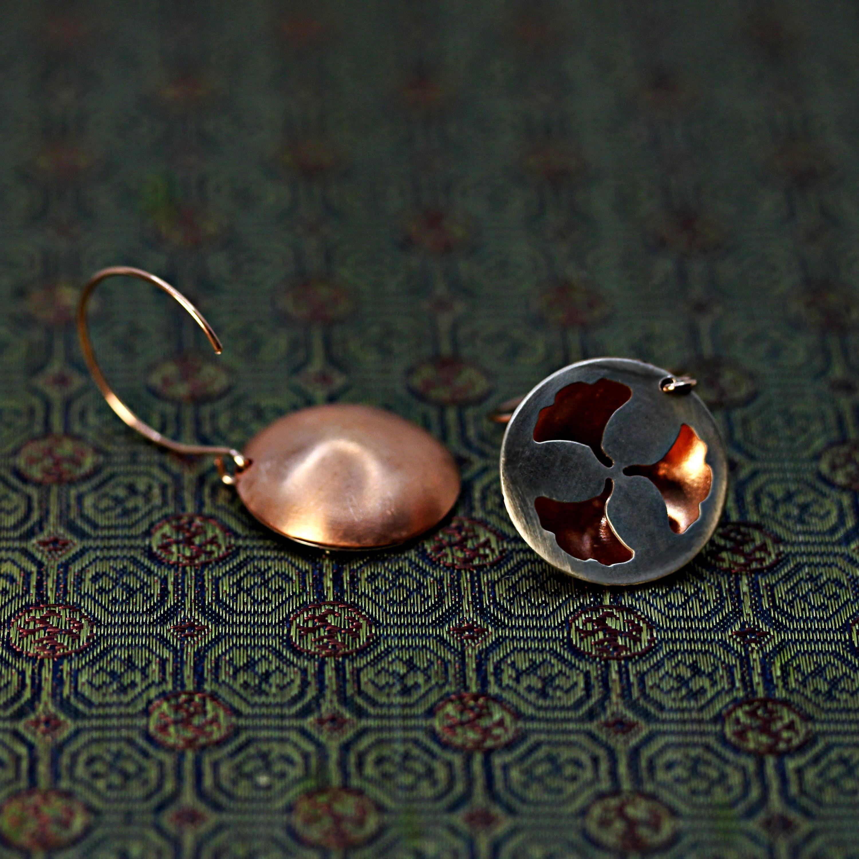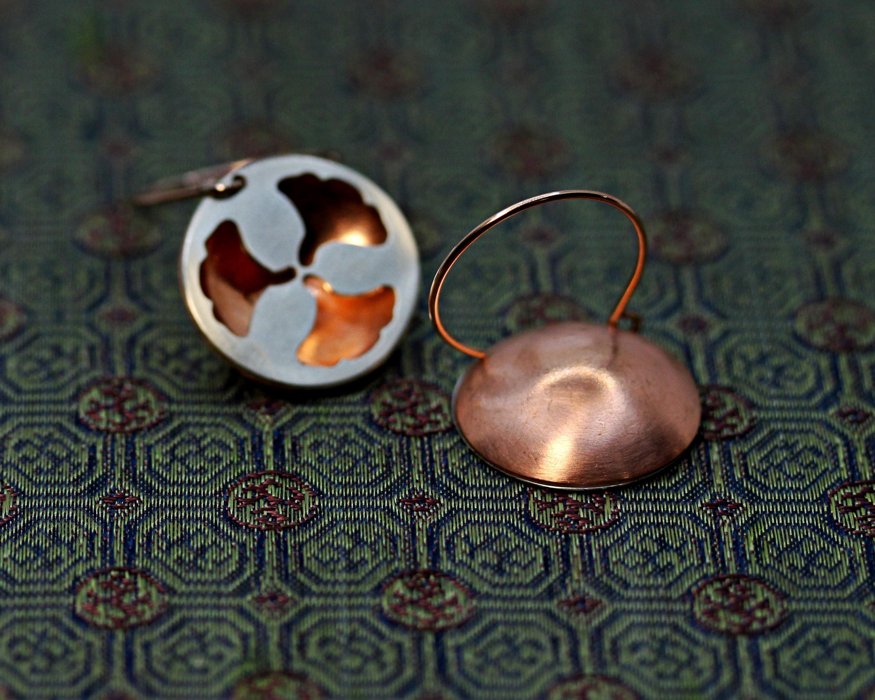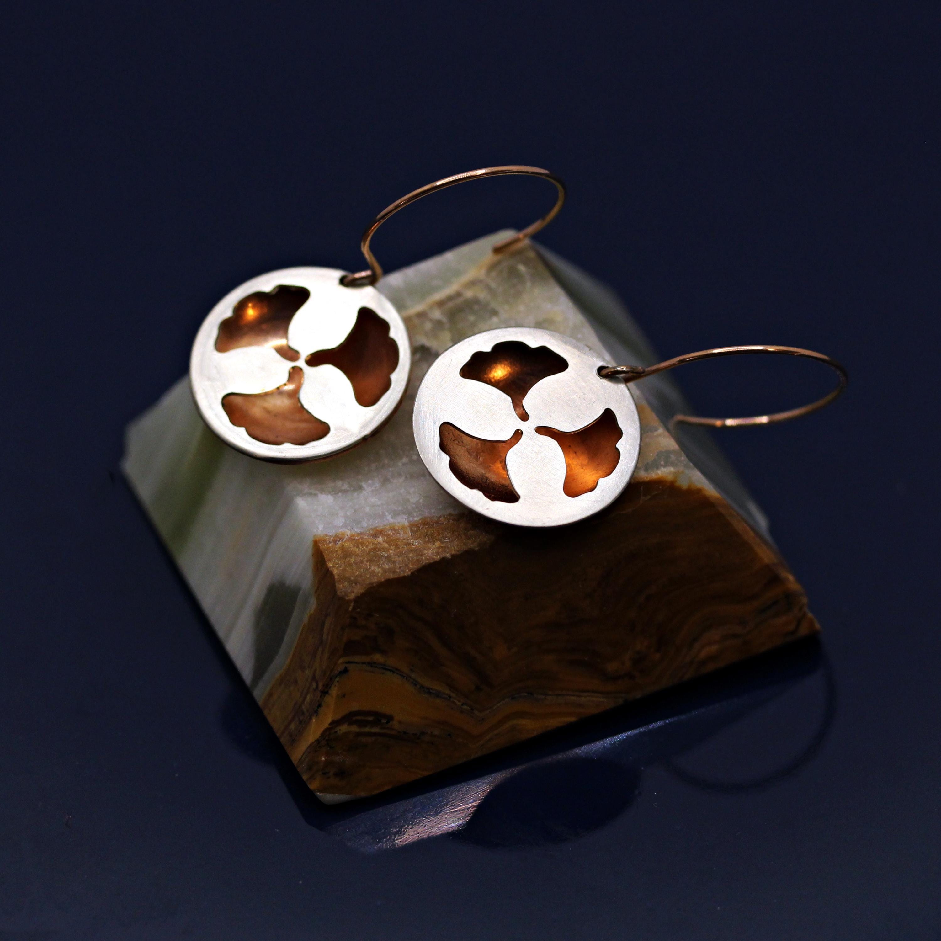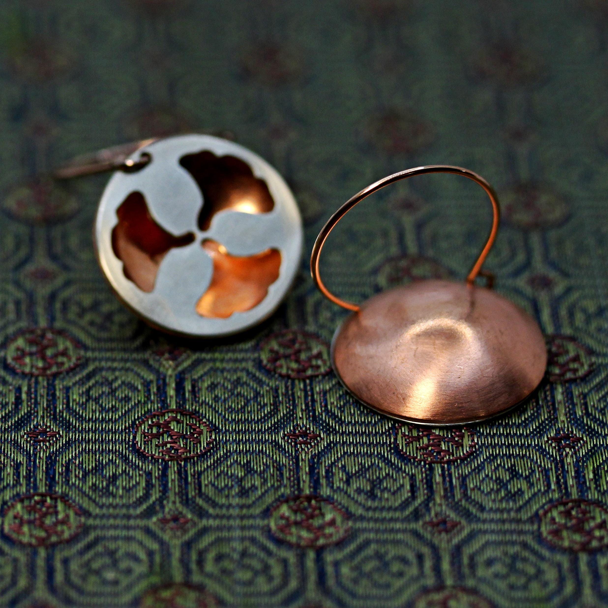 These beautiful round hoop earrings are decorated with a lovely abstract floral pattern. They feature delicate cut-outs and are lightweight, allowing them to vibrate with the warm orange and silver tones in muted metallic hues, creating an elegant yet bold statement. The sheen of the metal reflects subtle light, highlighting its artistic details and adding sophistication to the overall design. The entire piece exudes craftsmanship, inviting a closer look at the unique combination of materials and design elements, embodying both modern style and artistic flair.