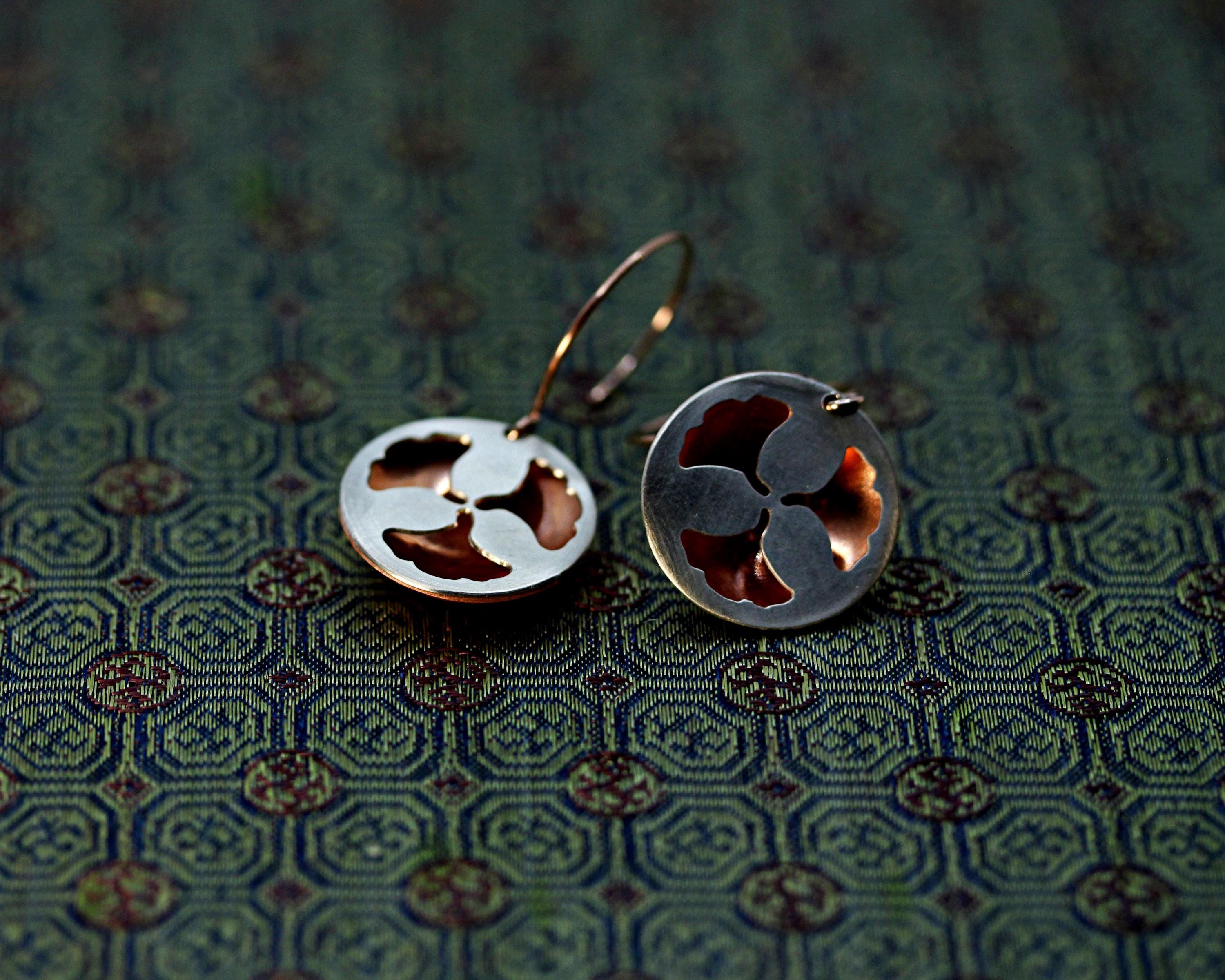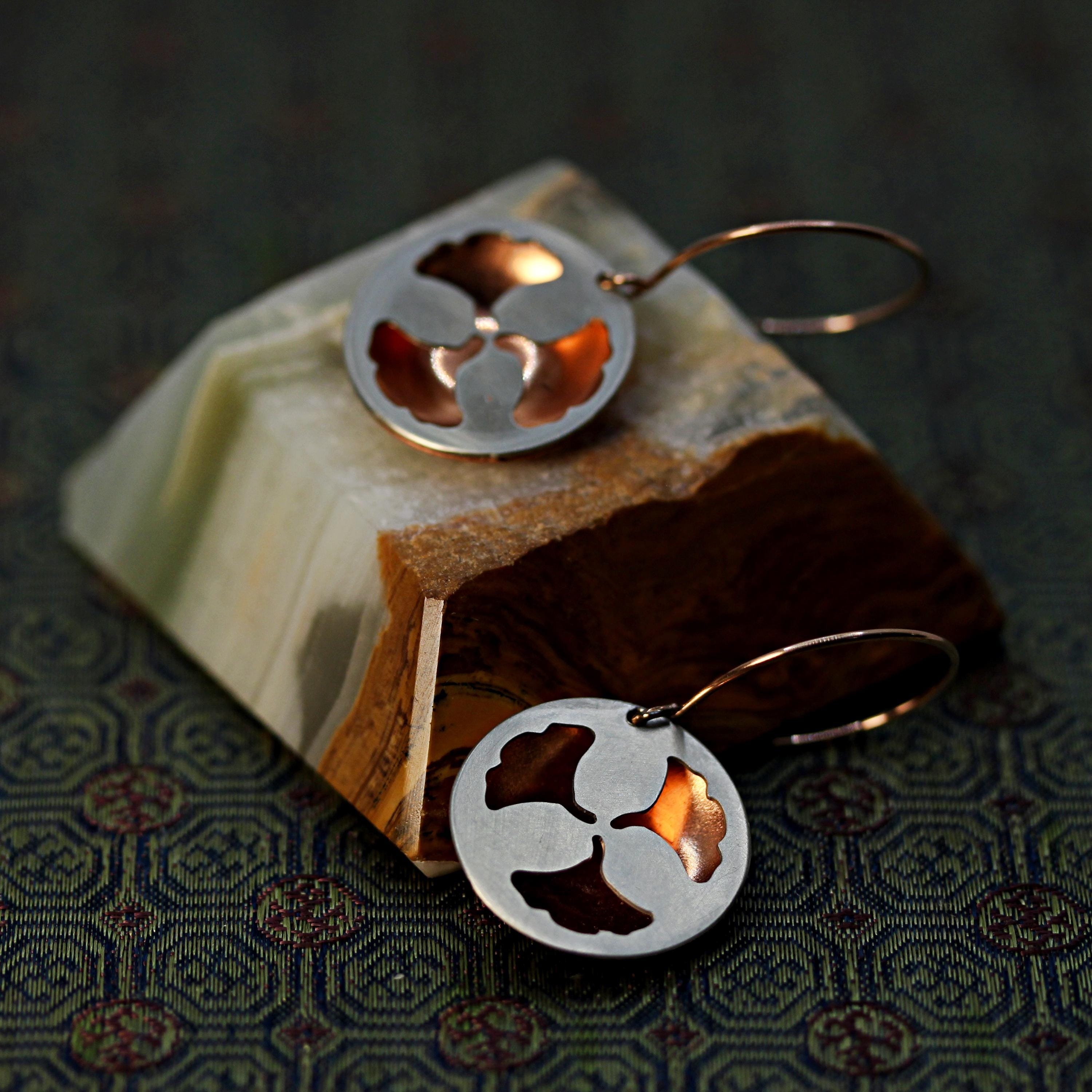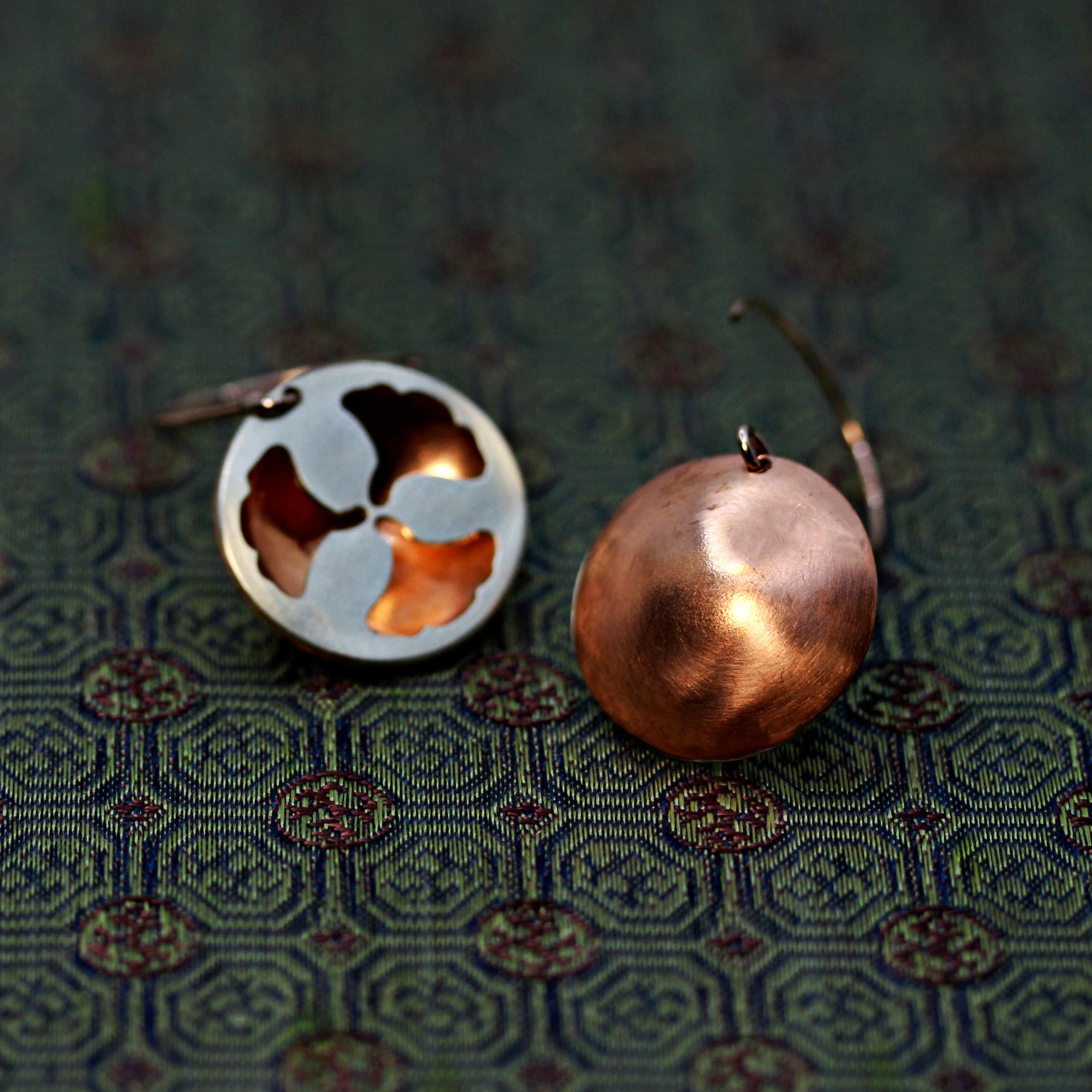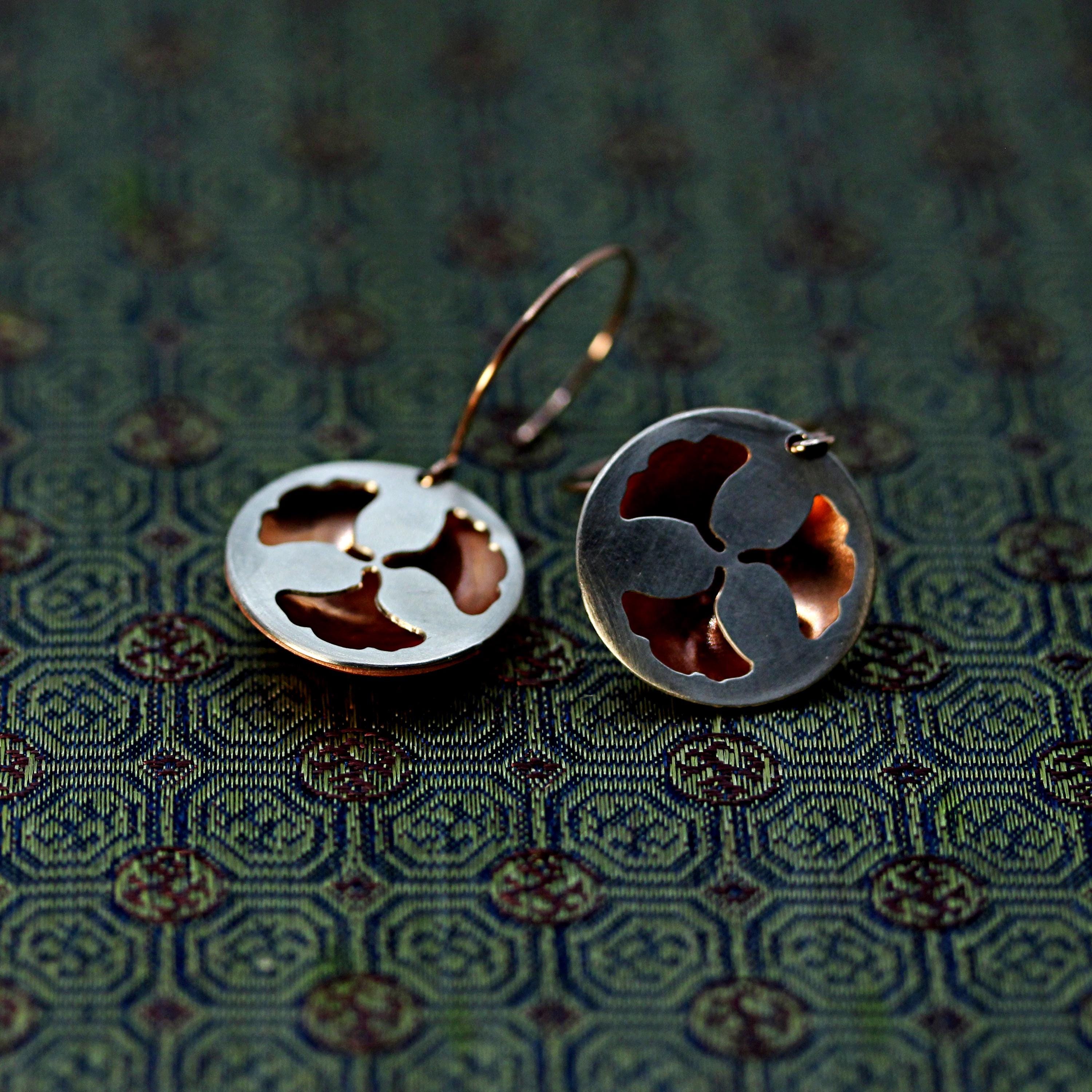 These beautiful round hoop earrings are decorated with a lovely abstract floral pattern. They feature delicate cut-outs and are lightweight, allowing them to vibrate with the warm orange and silver tones in muted metallic hues, creating an elegant yet bold statement. The sheen of the metal reflects subtle light, highlighting its artistic details and adding sophistication to the overall design. The entire piece exudes craftsmanship, inviting a closer look at the unique combination of materials and design elements, embodying both modern style and artistic flair.