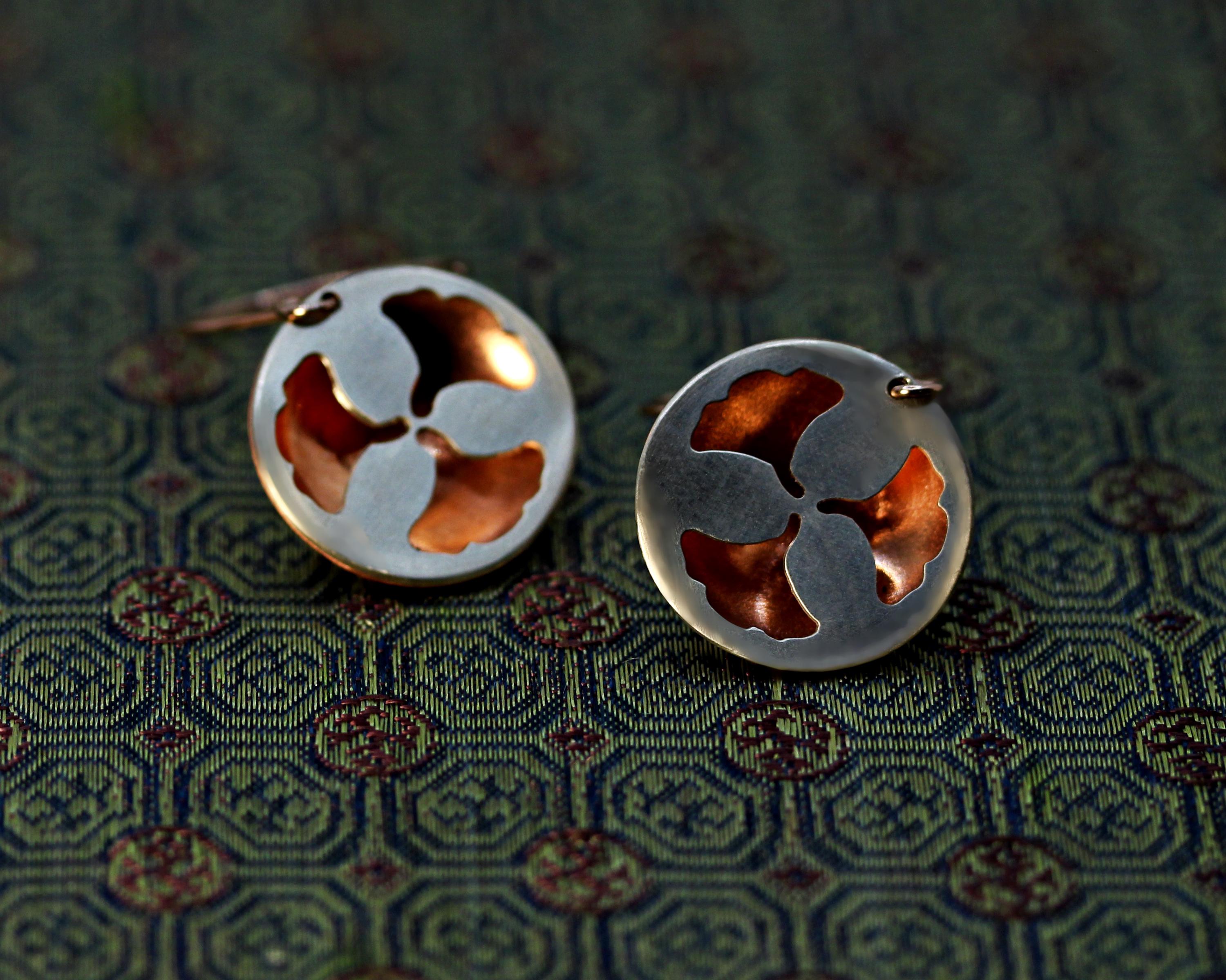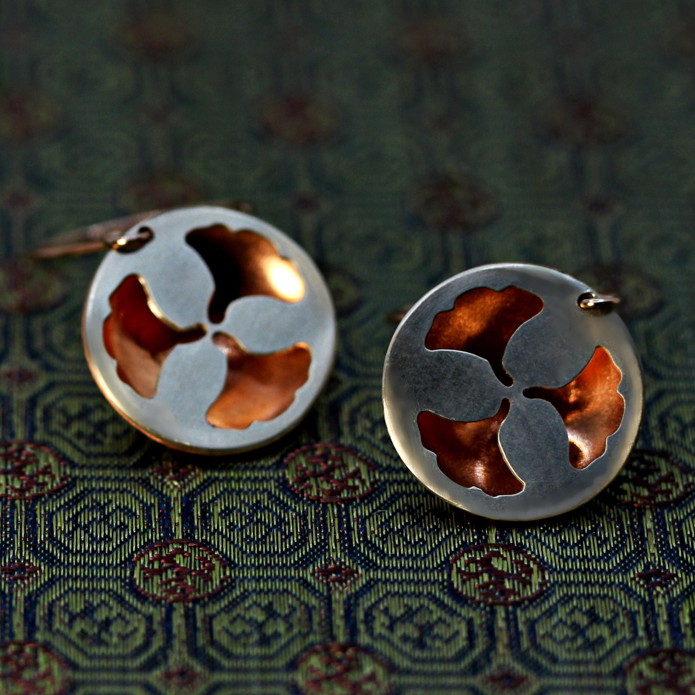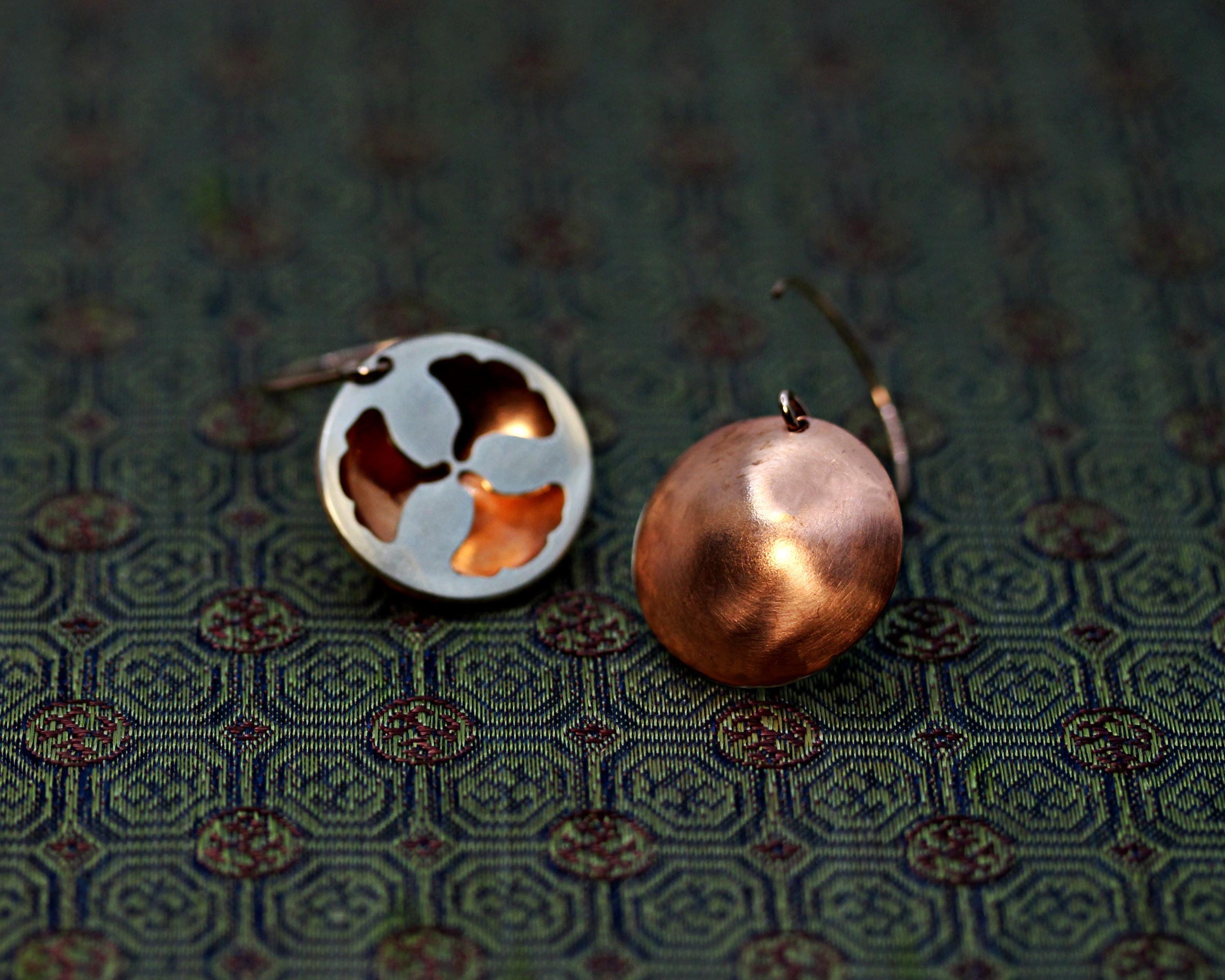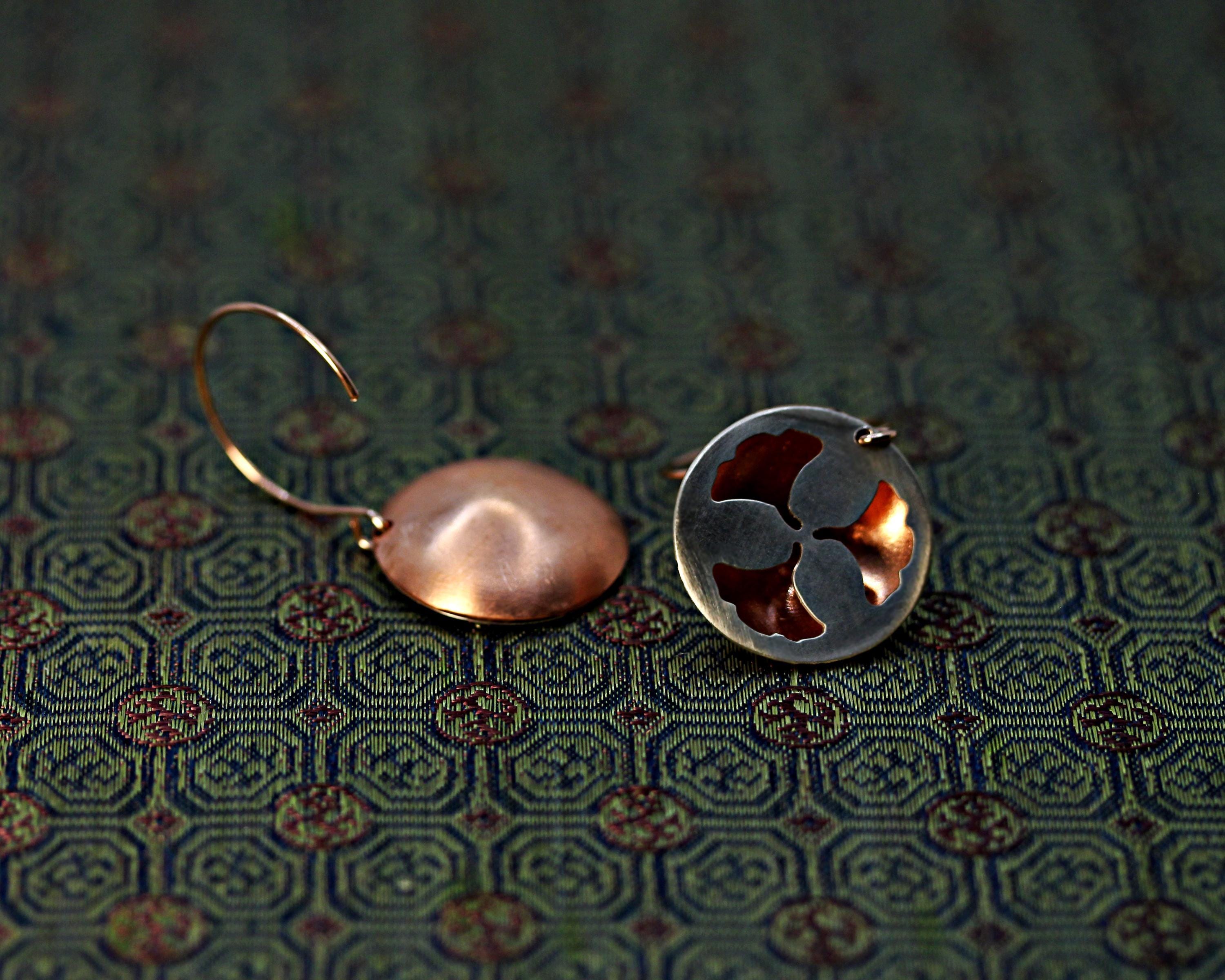 These beautiful round hoop earrings are decorated with a lovely abstract floral pattern. They feature delicate cut-outs and are lightweight, allowing them to vibrate with the warm orange and silver tones in muted metallic hues, creating an elegant yet bold statement. The sheen of the metal reflects subtle light, highlighting its artistic details and adding sophistication to the overall design. The entire piece exudes craftsmanship, inviting a closer look at the unique combination of materials and design elements, embodying both modern style and artistic flair.