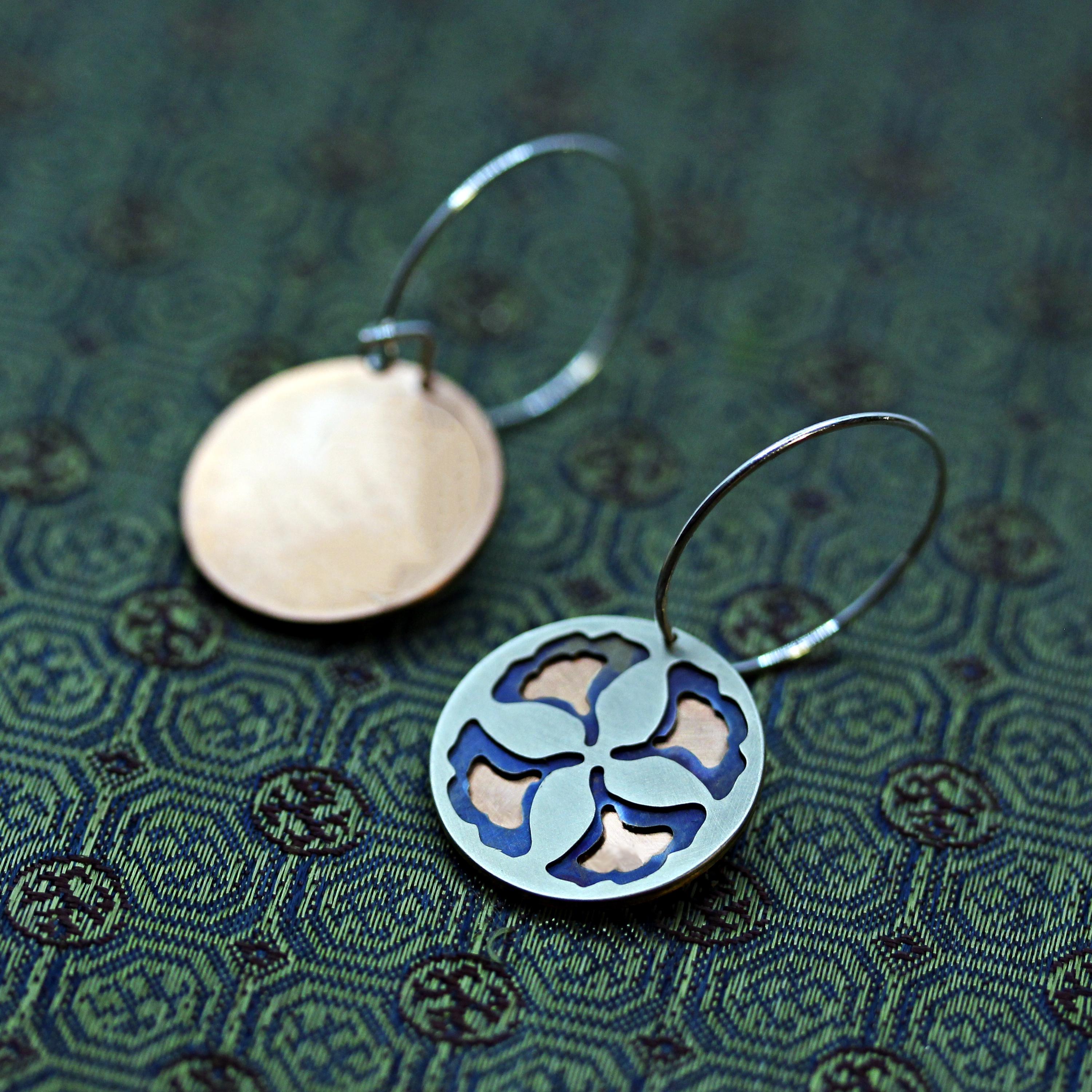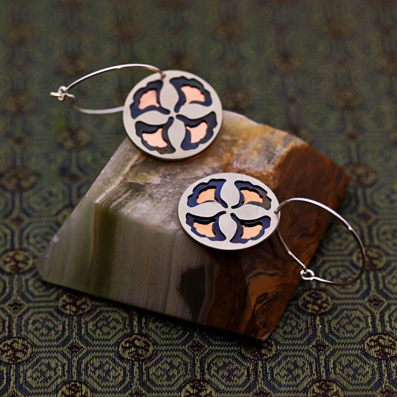 These beautiful round hoop earrings, delicately carved with four silver-toned ginkgo leaves, harmonize with the deep Flemish blue and warm copper, creating a look that feels both refined and expressive. The metal’s gentle sheen catches the light, bringing out the artistic details and adding a touch of sophistication. The piece radiates craftsmanship, inviting a closer look at the thoughtful interplay of materials and design that blends modern elegance with artistic character.