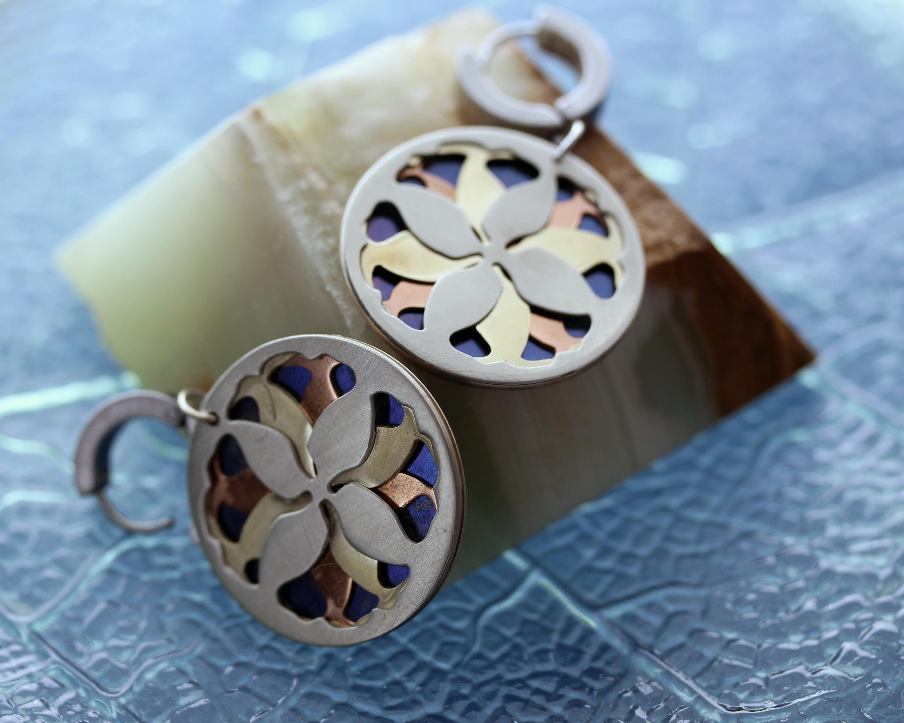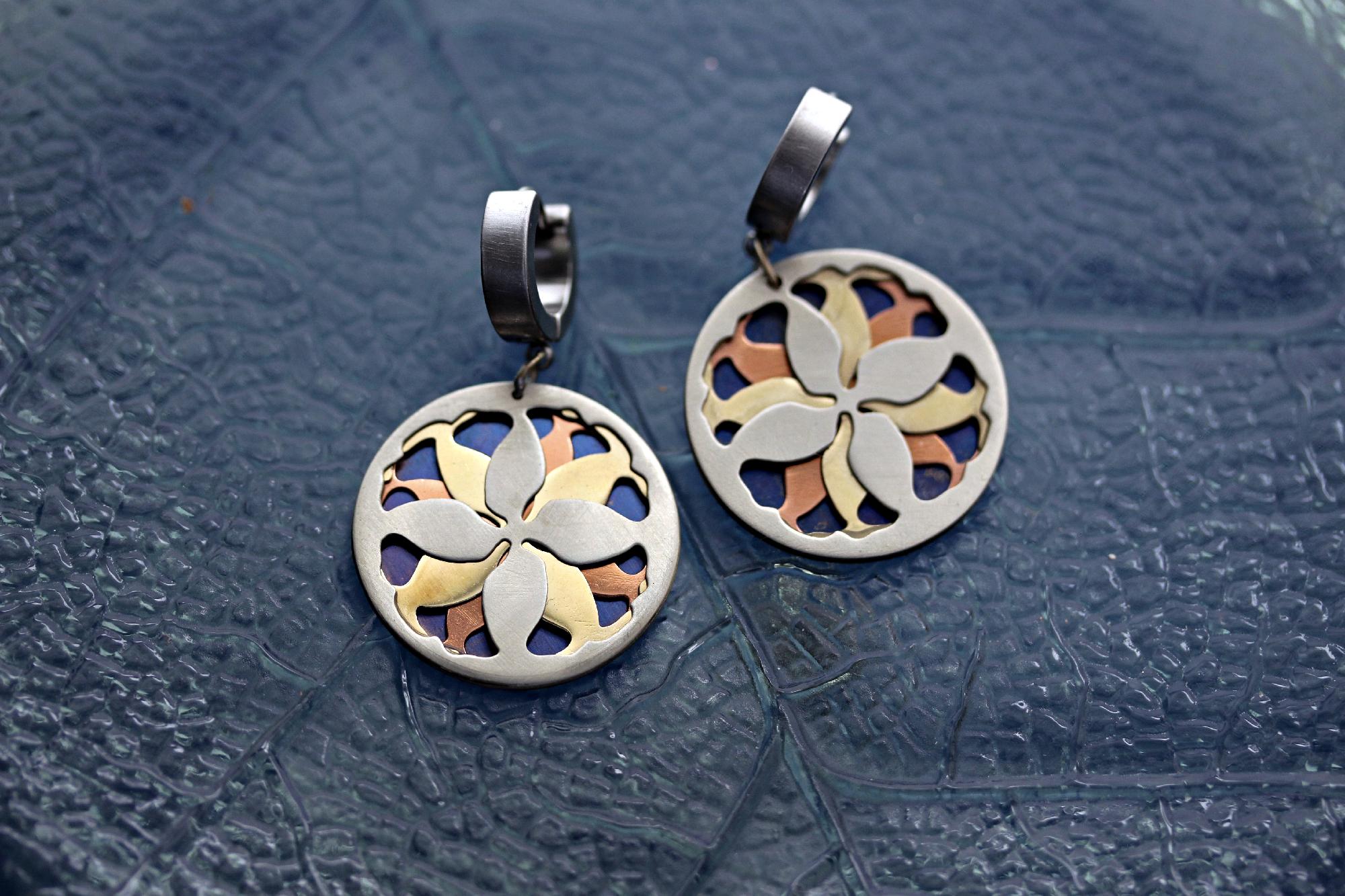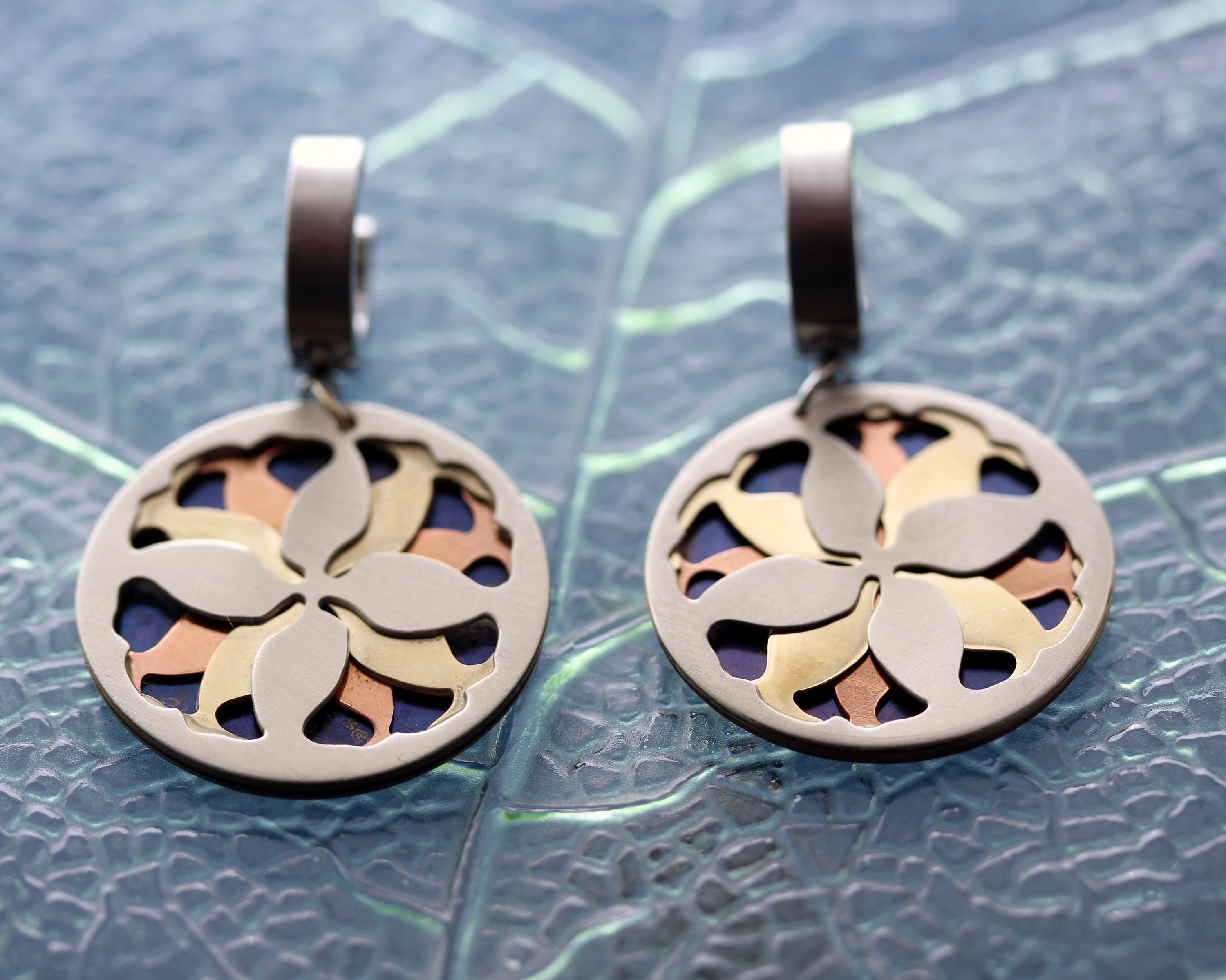 Różnobarwne refleksy zastosowanych metali , podkreślają kunszt wykonania i artystyczne detale. Zaprojektowane tak, aby delikatnie wibrować ruchem, te kolczyki łączą geometrię ornamentu inspirowanego liściem miłorzębu japońskiego.